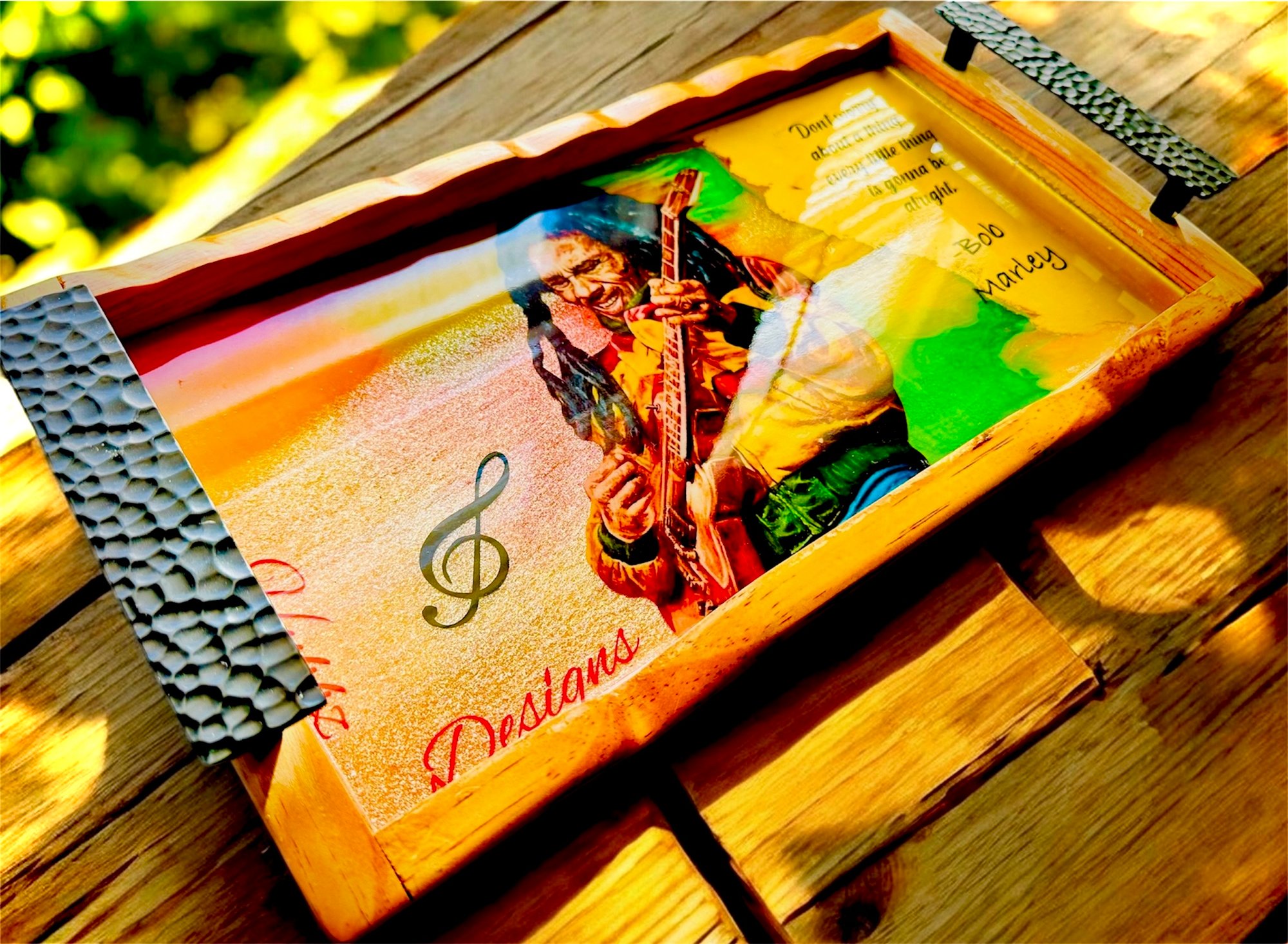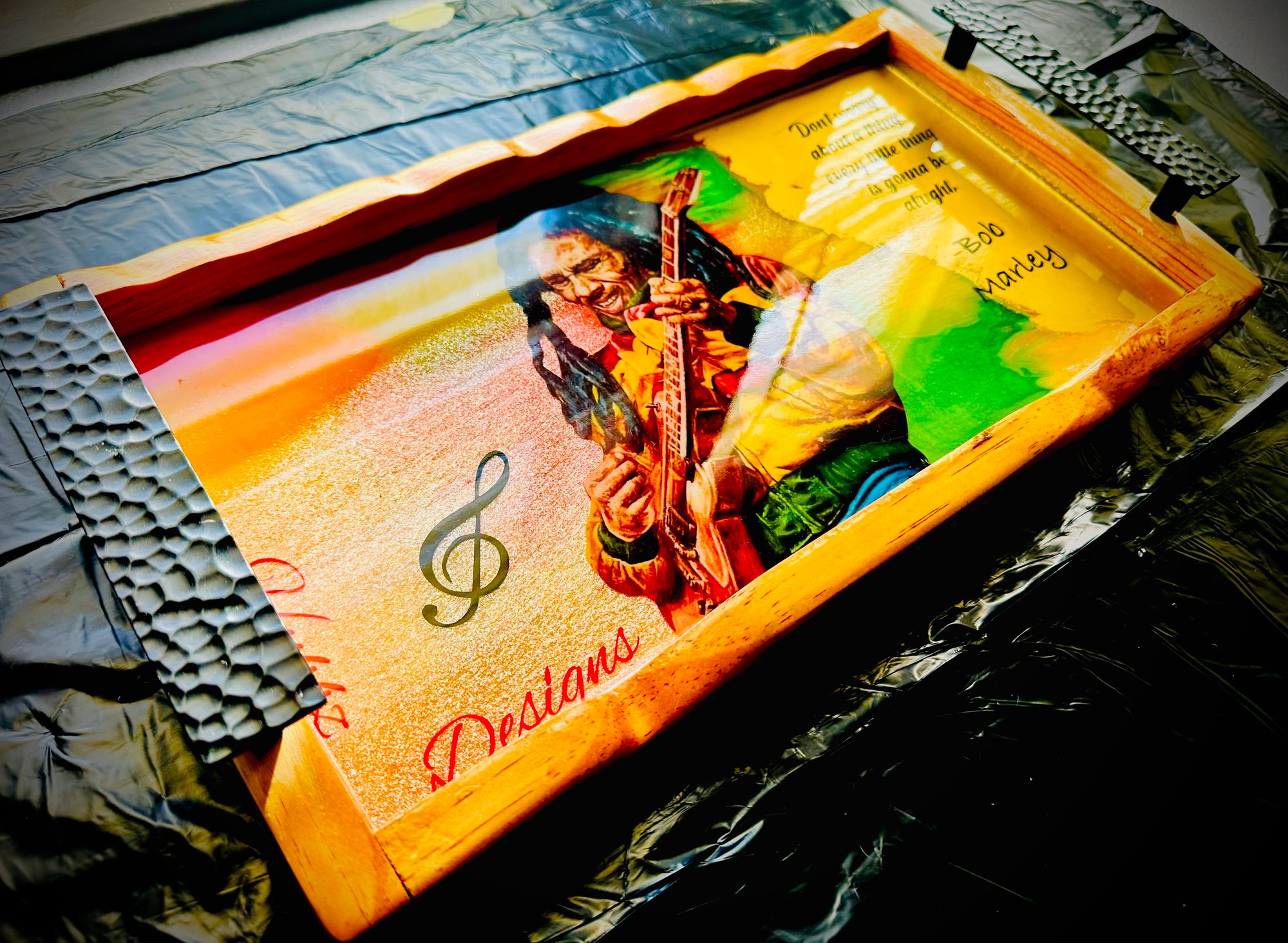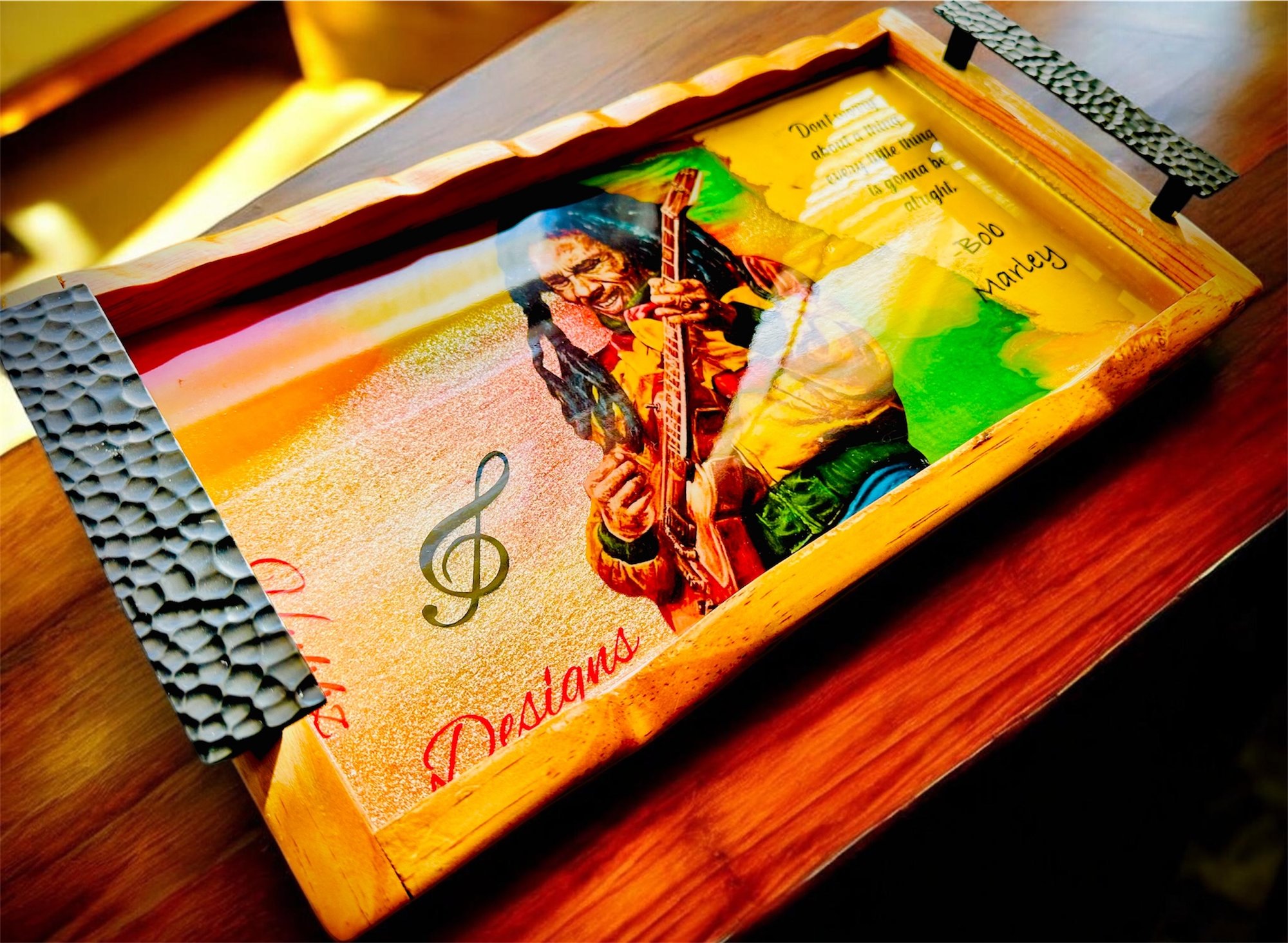 "Chill out and elevate your hookah experience with this vibrant Bob Marley-themed tray! Featuring the legendary musician playing his guitar, alongside the iconic quote 'Don't worry about a thing, every little thing is gonna be alright,' this tray brings a relaxed and positive vibe to any setting. Perfect for hookah shops, personal use, or as a unique gift, this tray combines functionality with a laid-back aesthetic. Keep your essentials organized and add a touch of reggae rhythm to your sessions. Get your Bob Marley tray today and let the good times roll!"